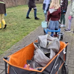 Im Rahmen unseres Draußen-Tags gingen wir also mit Handschuhen und Mülltüten durch den Ort und sammelten fleißig alles, was nicht hingehörte. Trotz Regen und Kälte waren die Kids motiviert bei der Sache und lernten nebenbei auch ein wenig über die Frühblüher, die überall hervorschauen.